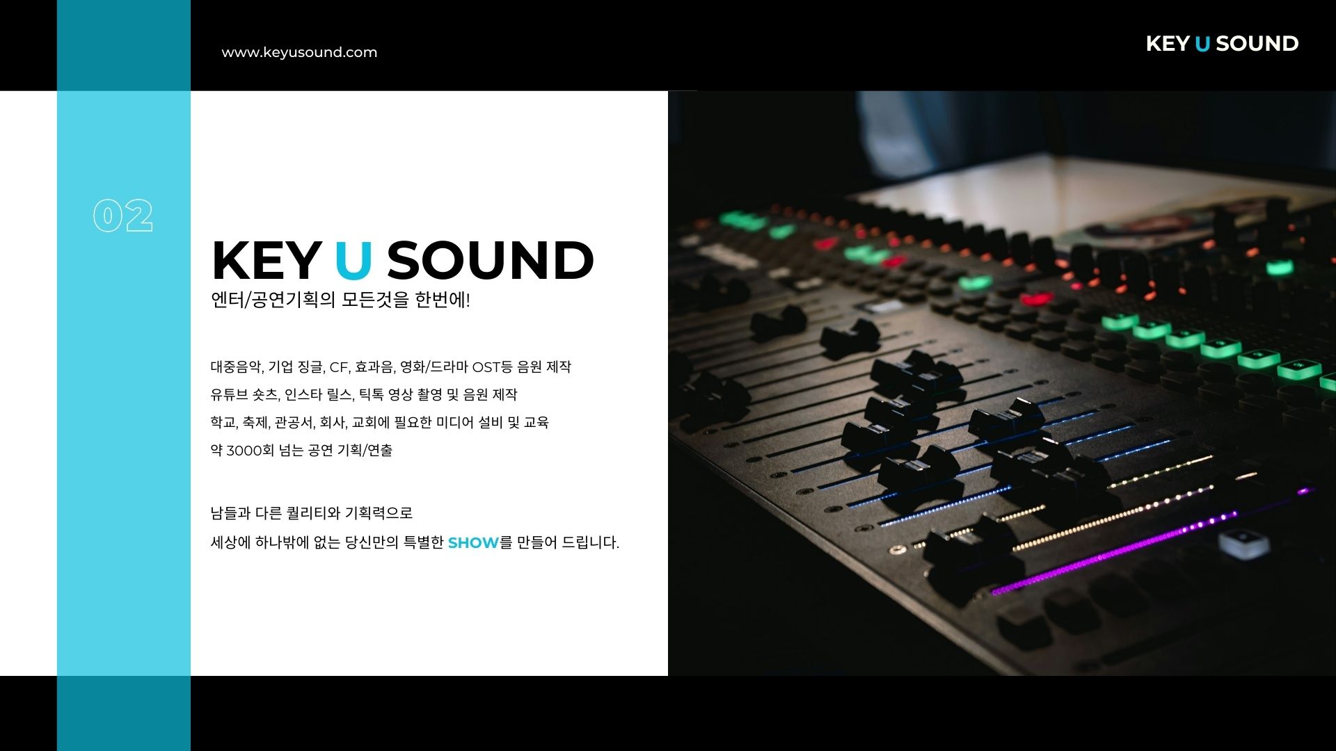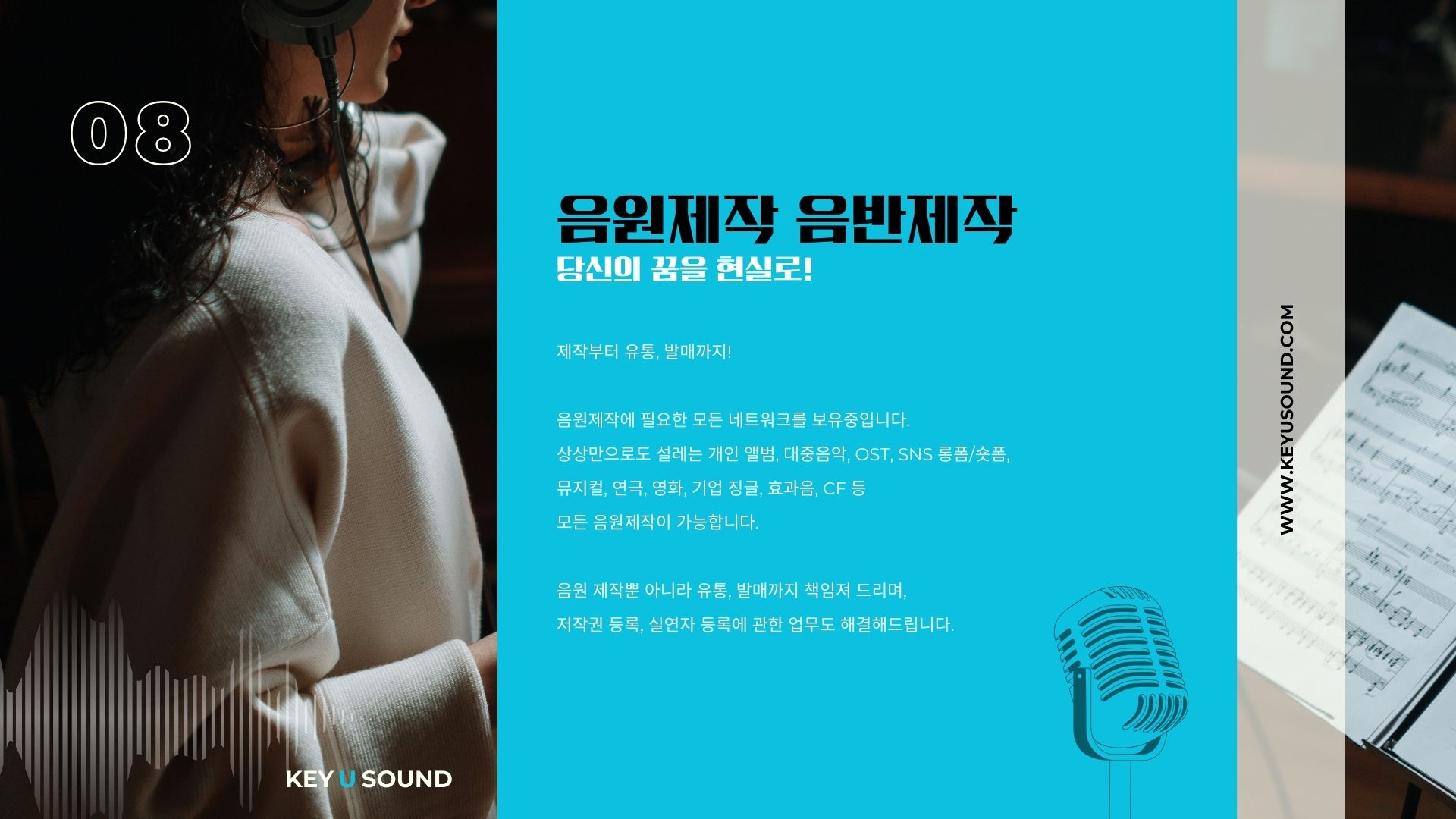 Key U Sound 는 2013년 설립된 문화 콘텐츠 제작 회사입니다.