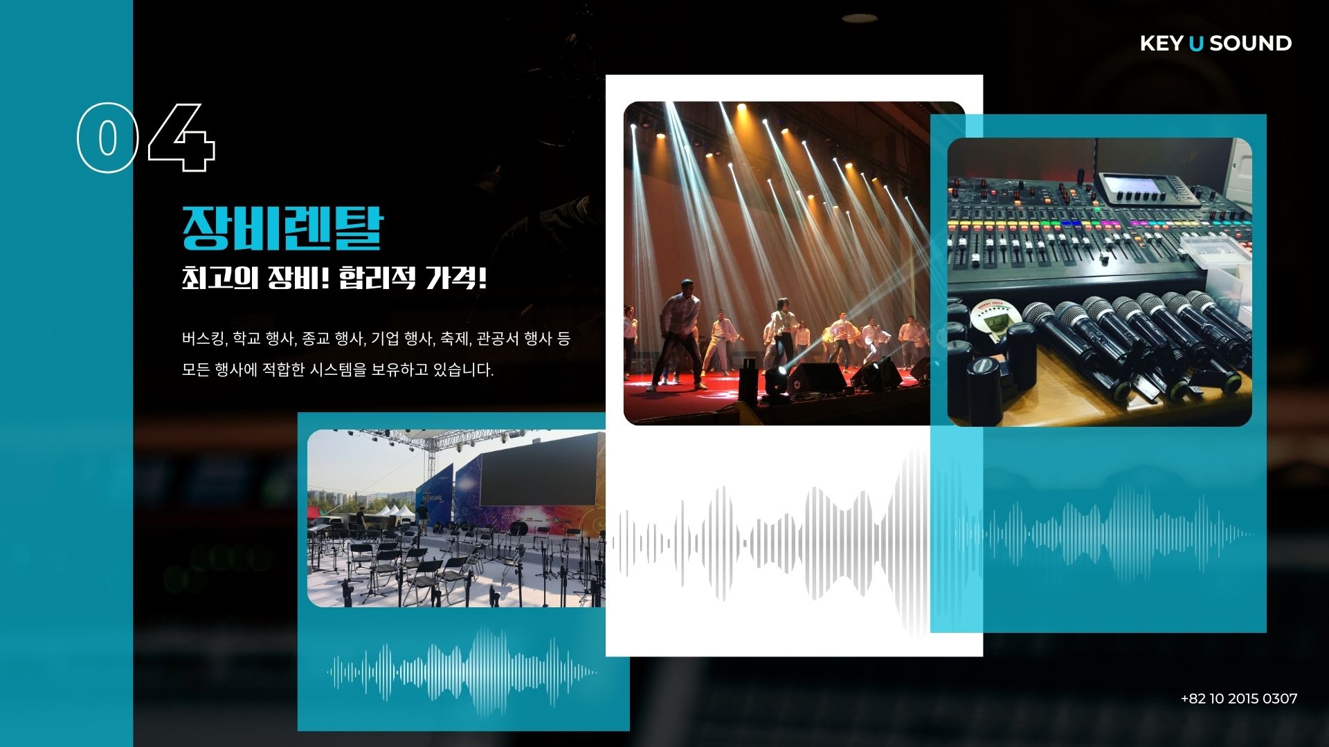 버스킹, 학교행사, 종교행사, 기업행사, 축제, 관공서행사등 모든 행사에 적합한 시스템을 보유하고 있습니다.